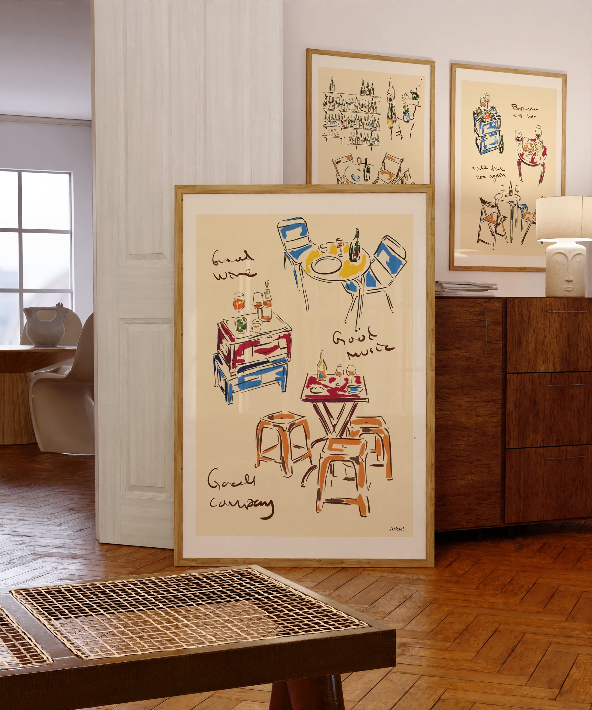 Celebrate the art of gathering with this spirited sketch of bustling cafe tables and flowing conversation. Bold splashes of primary colors highlight the energy of shared moments, complemented by whimsical text praising "Good Music" and "Good Company." It serves as a stylish reminder that the best days are spent surrounded by friends and great wine.